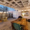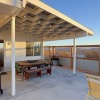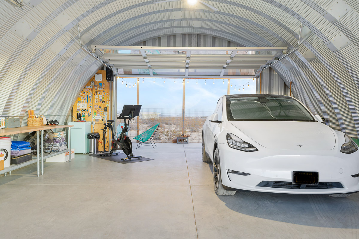 The home truly shines in its outdoor spaces, boasting three unique environments, enveloped in partially-fenced split-rail, including a BBQ-ready, covered, and enclosed patio with outdoor shower, plein air front patio with built-in fire pit for sunset gazing, and an outdoor living room adjoining the EV-ready, oversized, 2-car, plane-hanger-styled garage.