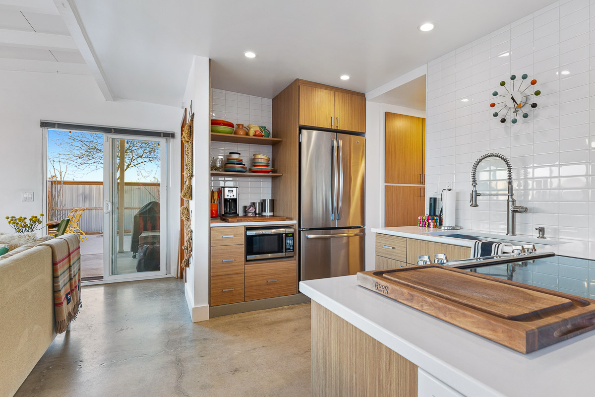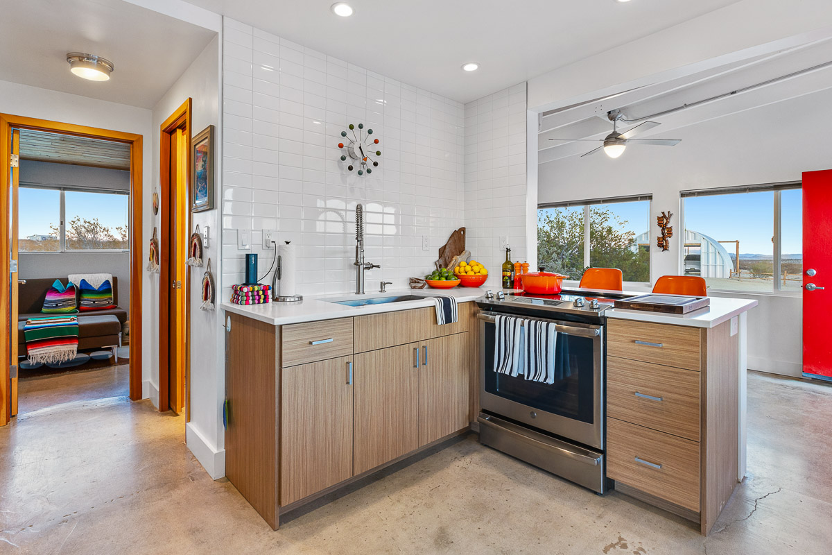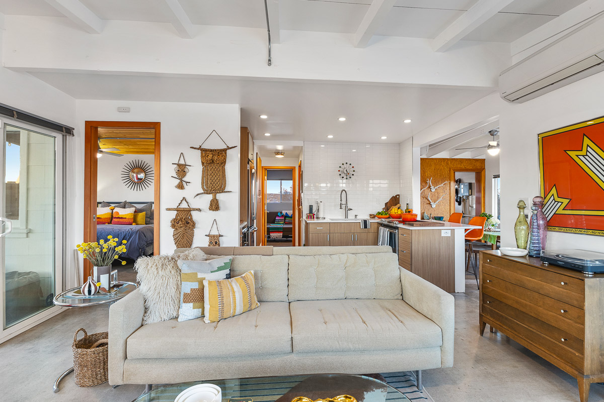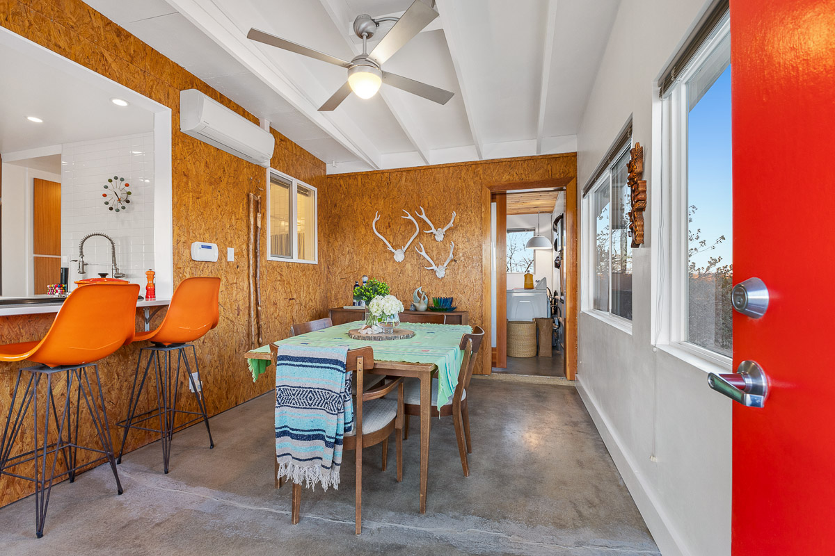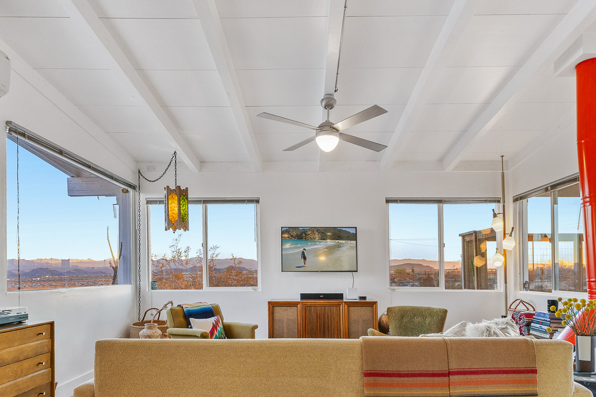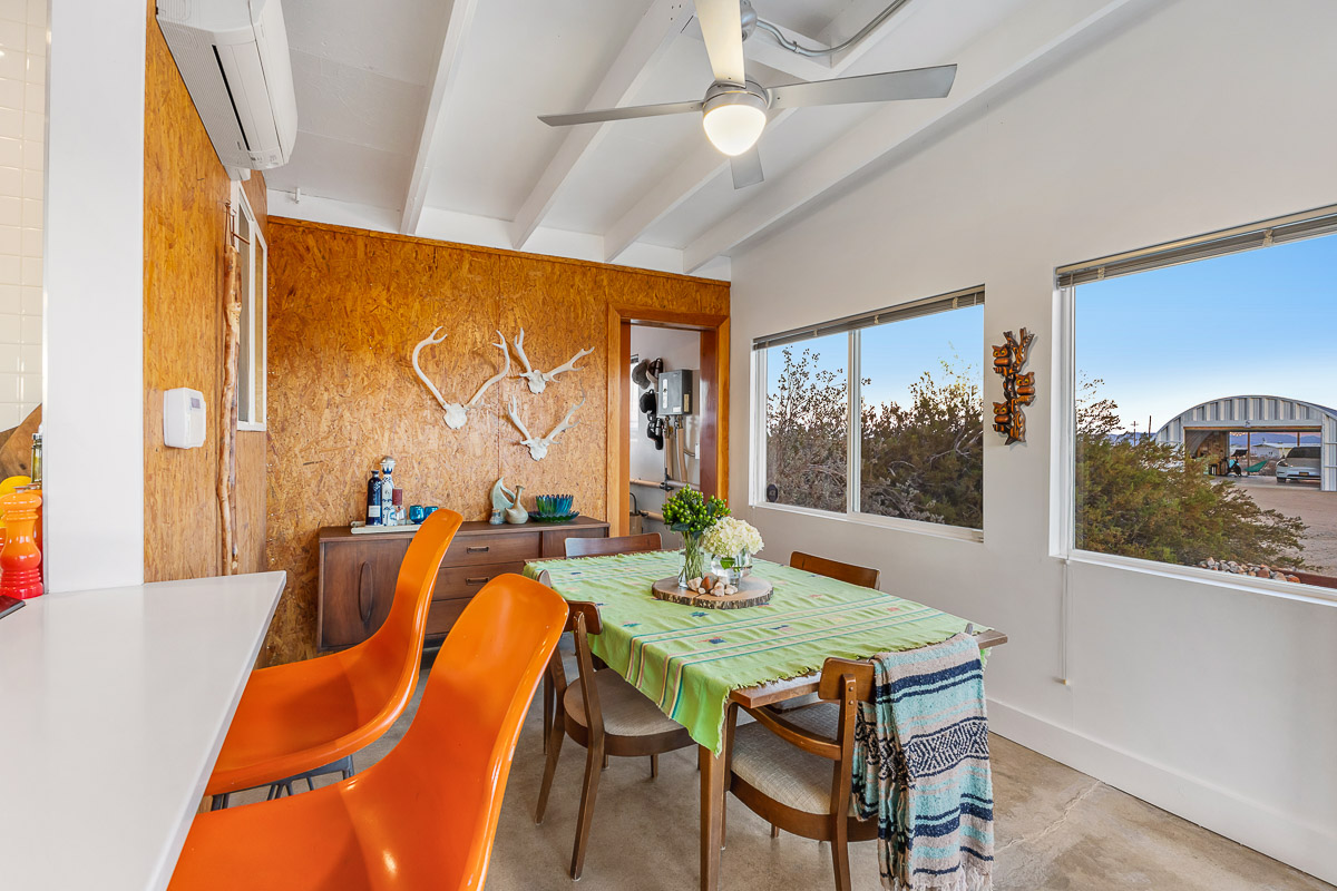 The heart of this home features an open concept living space underpinned by polished concrete floors, an updated kitchen with adjoining dining room and large windows flooding the space with natural light offering ever-changing views of the dramatic desert and mountain scenery.